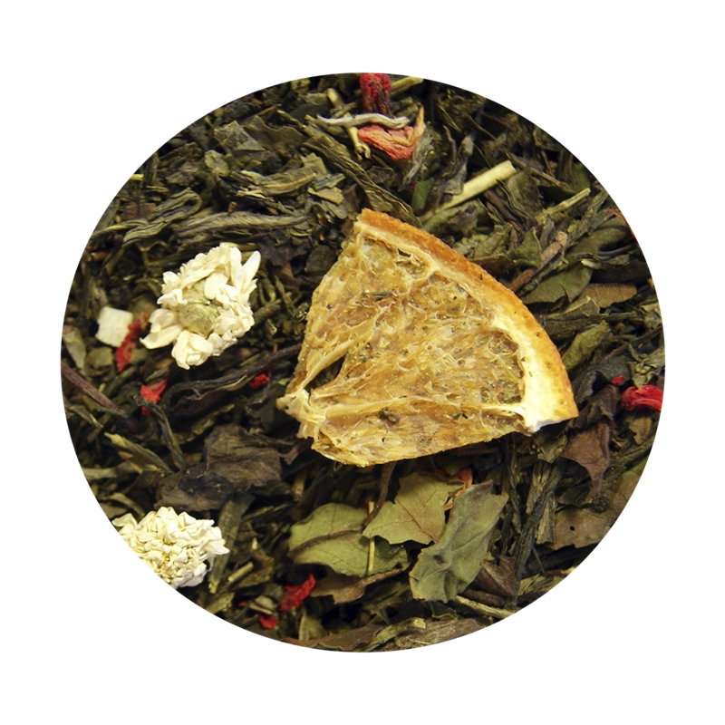 Ingredienser: grøn kinesisk økologisk sencha, hvid pai mu tan, appelsinskiver, kokosflager, saflorblomst, mandel flager og aroma