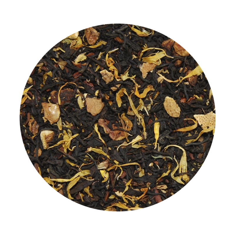 Ingredienser: Sort te, chai, tørrede æblestykker, orangeskaller, morgenfrueblomster, naturlig orange og creme aroma.