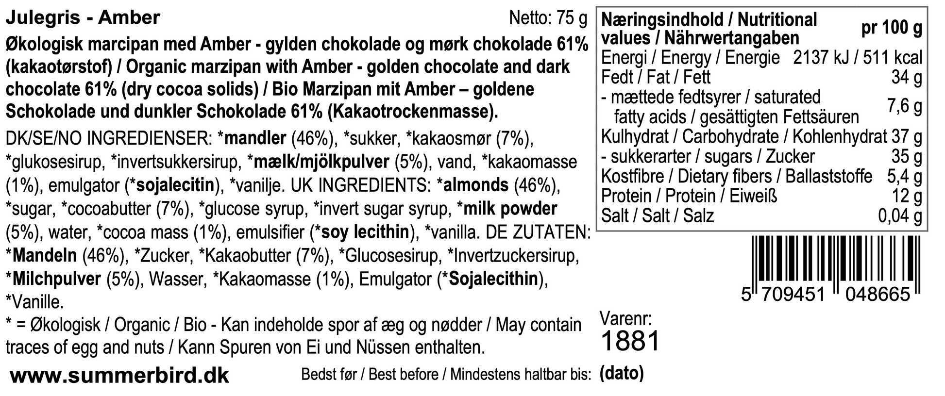 Julegris af ren marcipan, lavet på stenvalsede middelhavsmandler, overtrukket med vores prisvindende og populære Amber Classic-chokolade og afslutningsvist dekoreret med mørk chokolade Amazonas 61%.