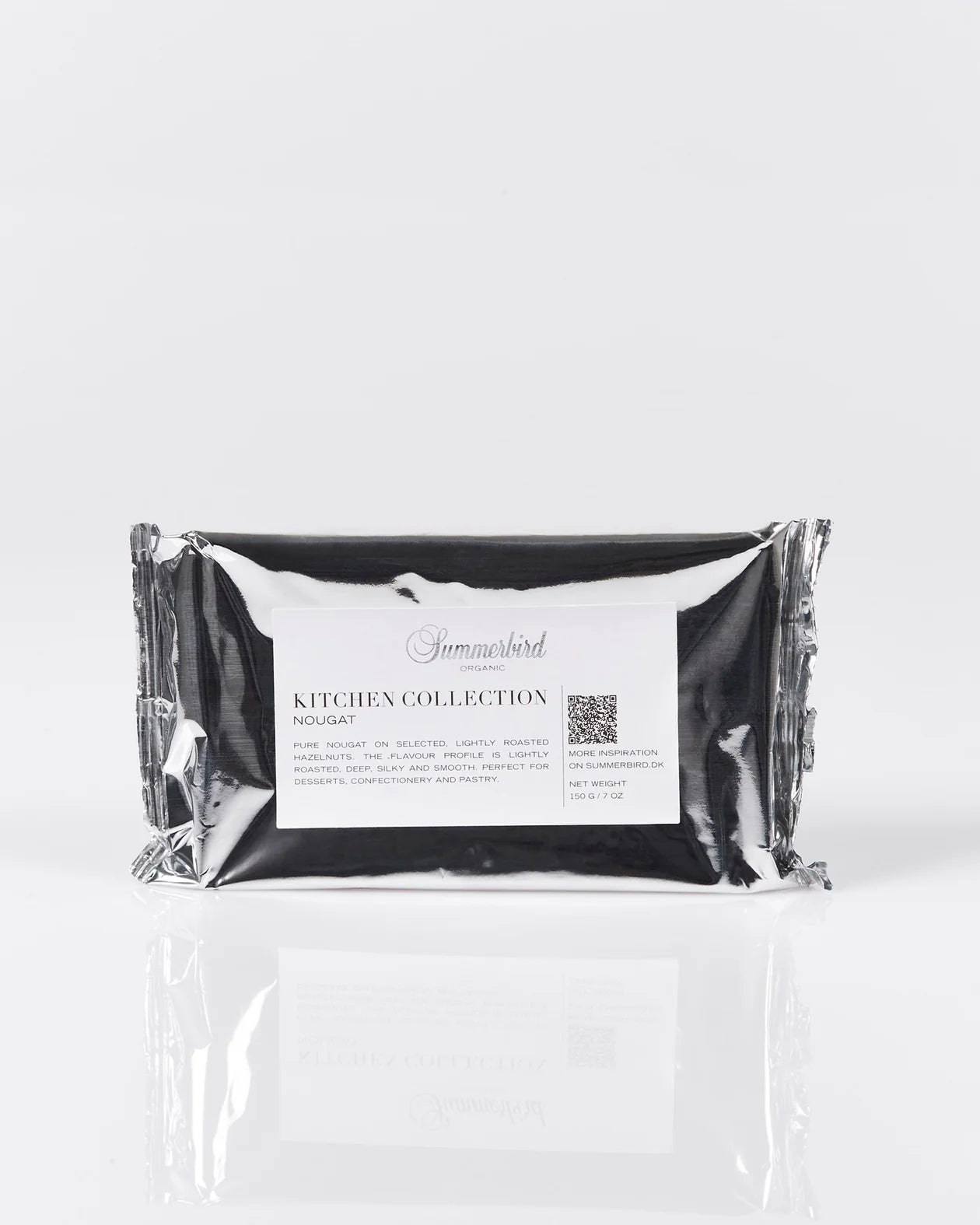 Summerbird nougat består af nøje udvalgte hasselnødder, der ristes let, finvalses og blandes med en frugtig mørk chokolade 70 % på rene Peru-kakaobønner. Resultatet er en dyb og intens nougat med en tydelig smag af hasselnødder og en silkeblød tekstur. Nougaten egner sig perfekt til konfekt, bagværk og desserter.
