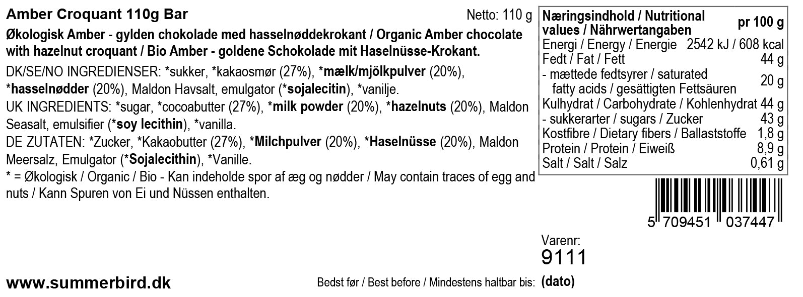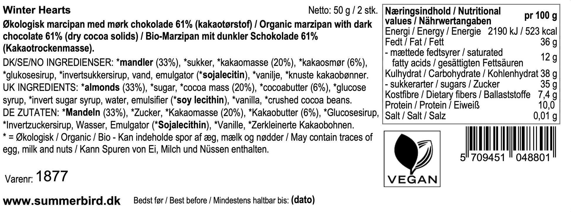 SUMMERBIRD - AMBER ORANGE CROQUANT - INGREDIENSER: *Sukker, *kakaosmør (27%), *MÆLKEPULVER (20%), *HASSELNØDDER (20%), Maldon Havsalt, emulgator (*SOJALECITIN), *vanilje. - *=Økologisk Kan indeholde spor af ÆG. - NÆRINGSINDHOLD pr. (100 g) Energi: 2542 kj / 608 kcal, Fedt: 44 g - heraf mættede fedtsyrer: 20 g, Kulhydrater: 44 g – heraf sukkerarter: 43 g, Kostfibre: 1,8 g, Protein 8,9 g, Salt: 0,61 g ¬| SUMMERBIRD Winter Hearts - INGREDIENSER: MANDLER* (33%), *sukker, *kakaomasse (20%), *kakaosmør (6%), *glukosesirup, *invertssukkersirup, vand, emulgator (*SOJALECITIN), *vanilje, *knuste kakaobønner - * = Økologisk Kan indeholde spor af æg og mælk - NÆRINGSINDHOLD pr. (100 g) Energi: 2190 kj / 523 kcal, Fedt: 36 g - heraf mættede fedtsyrer: 12 g, Kulhydrater: 38 g – heraf sukkerarter: 35 g, Kostfibre: 7,4 g, Protein 10 g, Salt: 0,01 g | SUMMERBIRD – Winter Edition - INGREDIENSER: *Sukker, *kakaosmør (22%), *invertsukkersirup, *MÆLKEPULVER (13%), *kakaomasse (10%), *HASSELNØDDER, *SMØR, *glukosesirup, vand, emulgator (*SOJALECITIN), *rødbedepulver, *knuste kakaobønner, *vanilje, *lakridspulver, *solbærpuré, *citronsaft, *solbærpulver, *hindbærpuré, Maldon Havsalt, *orangeblomstvand, *blodappelsinolie, *hyldeblomstekstrakt, Læsø Sydesalt, *citronolie, *pebermynteolie. - *=Økologisk - kan indeholde spor af ÆG. - NÆRINGSINDHOLD pr. (100 g) Energi: 2300 kj / 550 kcal, Fedt: 36 g - heraf mættede fedtsyrer: 20 g, Kulhydrater: 50 g – heraf sukkerarter: 48 g, Kostfibre: 2,5 g, Protein 5,9 g, Salt: 0,15 g