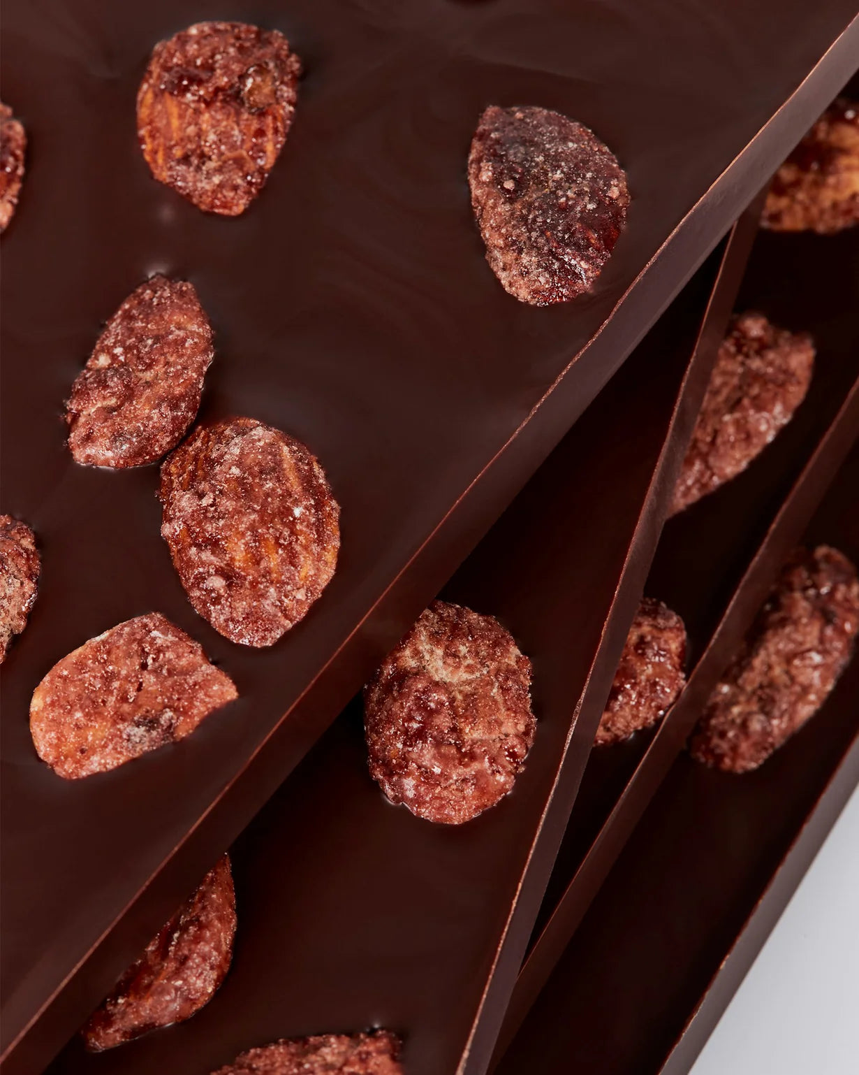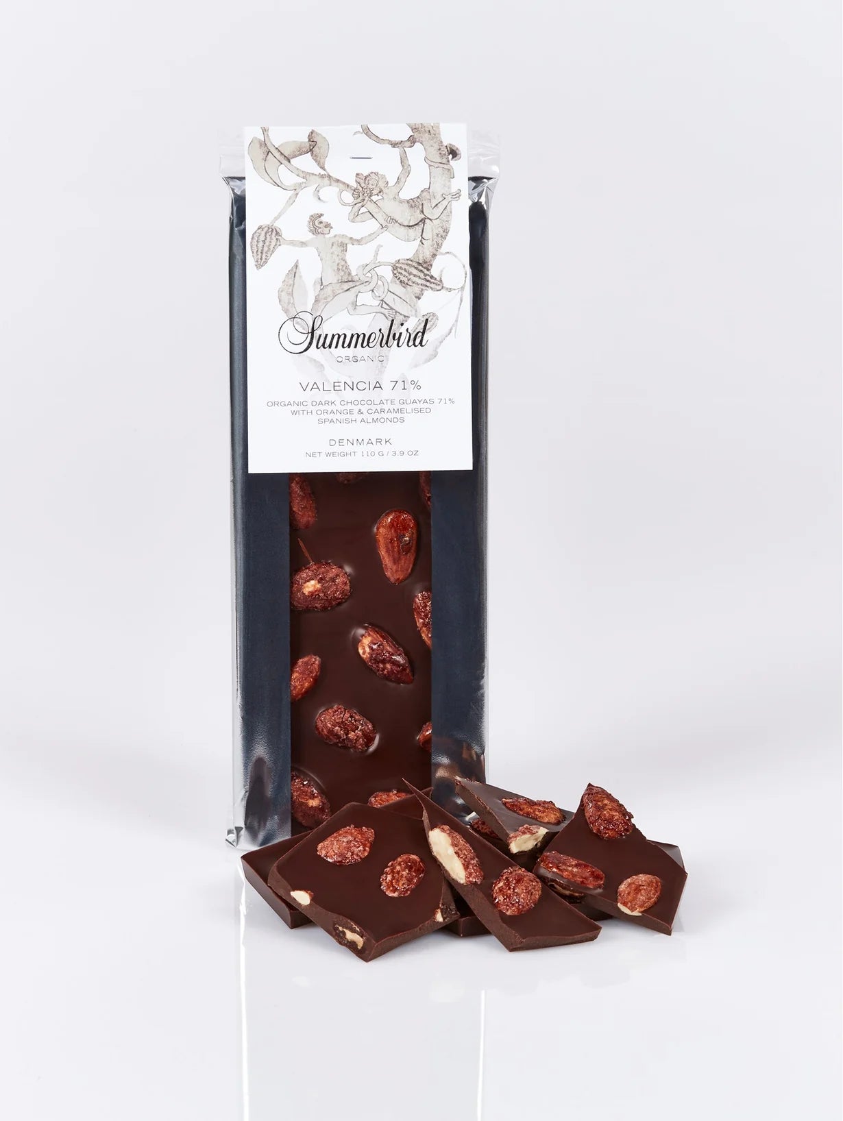En mørk økologisk chokoladebar, let parfumeret med orange, drysset med karamelliserede økologiske spanske mandler og baseret på Summerbirds mørke chokolade Guayas 71 % af kakaobønnen Arriba Nacional, der vokser langs Guayas-floden i Ecuador og anses for at være blandt de fineste i verden. En dyb og kraftfuld chokoladebar med en sprød tekstur.
